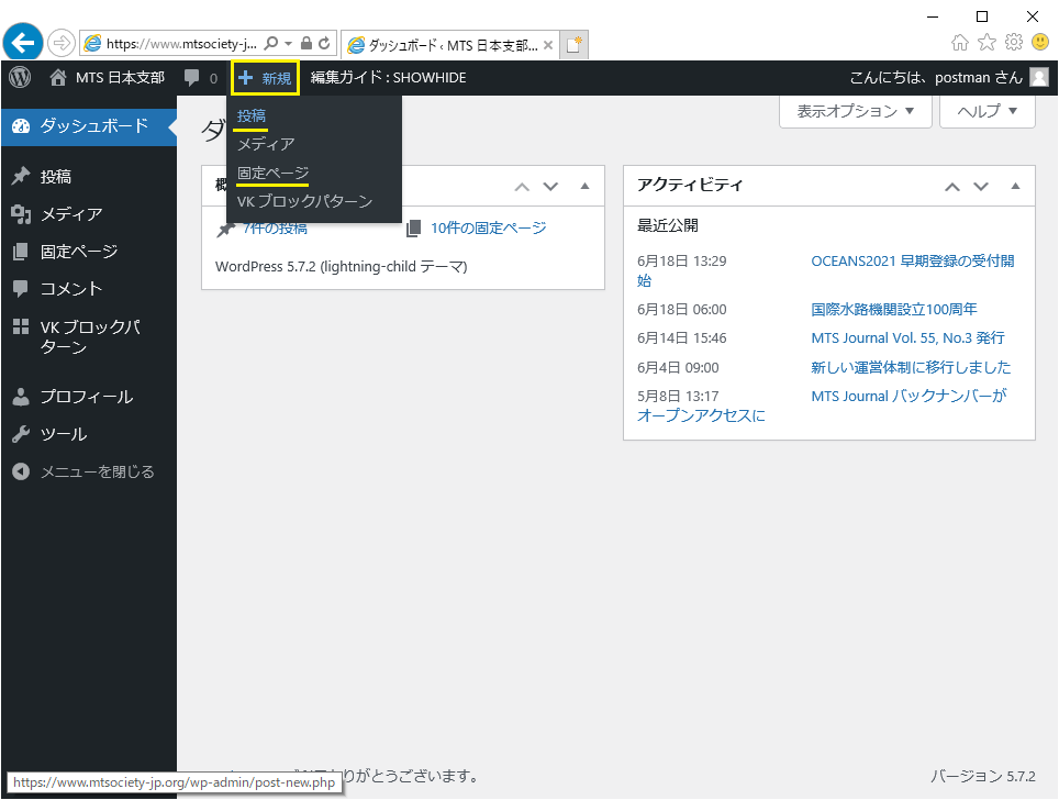 新たな「お知らせ」記事を作成するには、メニューの「新規」をポイントし、「投稿」をクリックします。