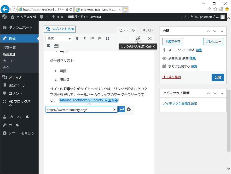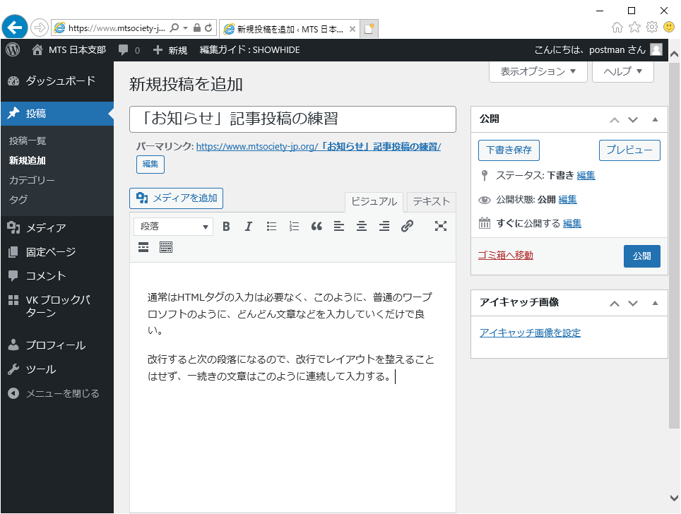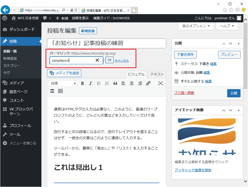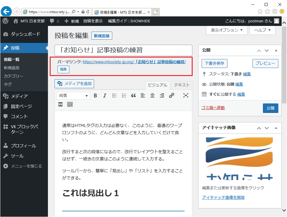 このままだと、記事への直接のURLは、記事のタイトル(ここでは『「お知らせ」記事投稿の練習』)が使われます。