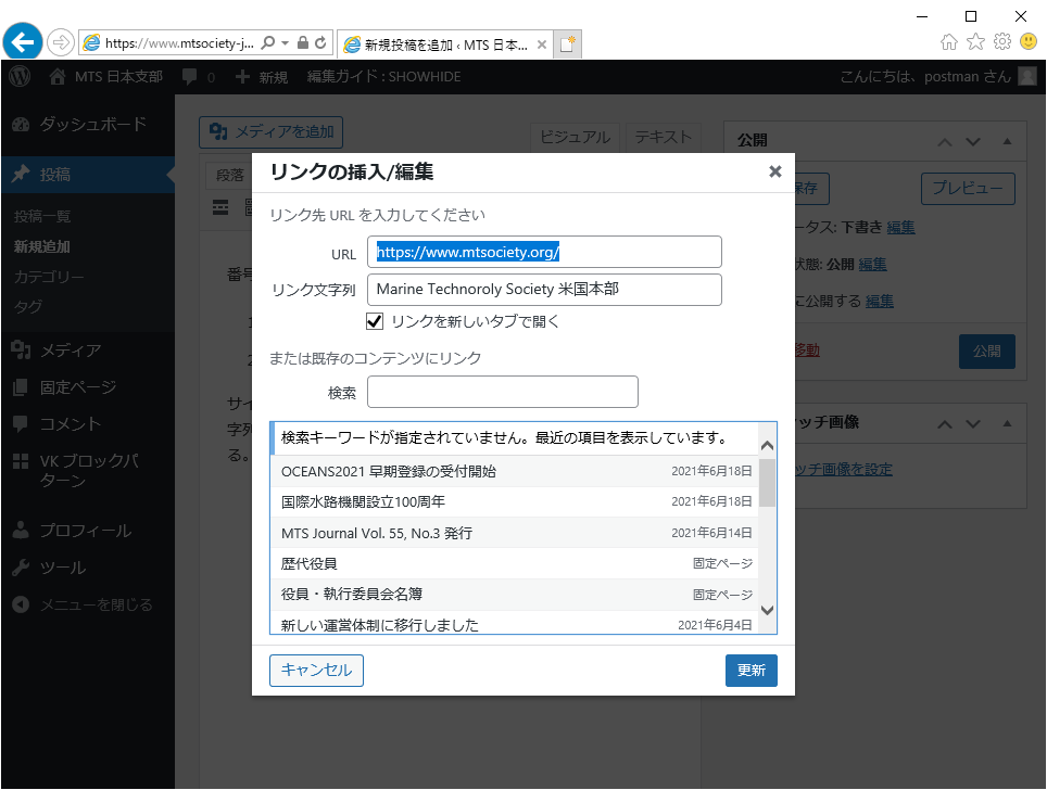 サイト内の最近の記事や固定ページなど、既存のコンテンツへのリンクは、リストから選択できます。