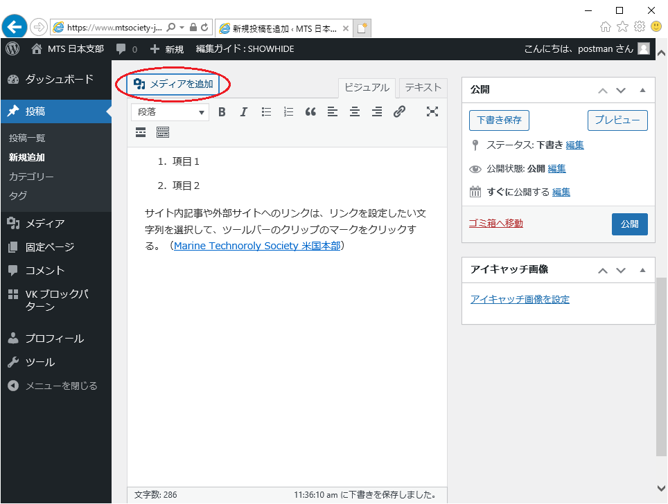 記事内への画像の挿入は「メディアを追加」ボタンから行います。