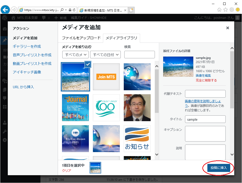 「ファイルをアップロード」のタブに新しい画像ファイルをドラッグすると「メディアライブラリ」に登録されますので、画像を選択した状態で「投稿に挿入」ボタンを押すと、記事内に画像が配置されます。