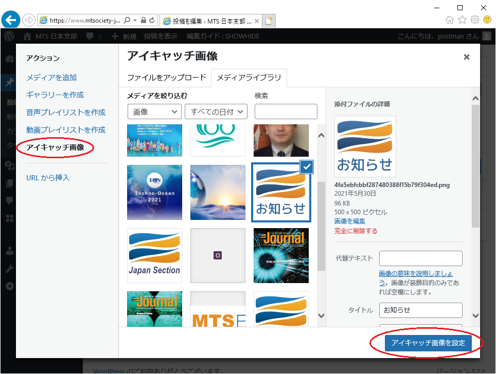 また、「メディアを追加」の画面で、左側の「アクション」のリストから「アイキャッチ画像」を選択して「アイキャッチ画像に設定」ボタンを押すと、選択した画像が記事一覧のアイキャッチ画像として設定されます。