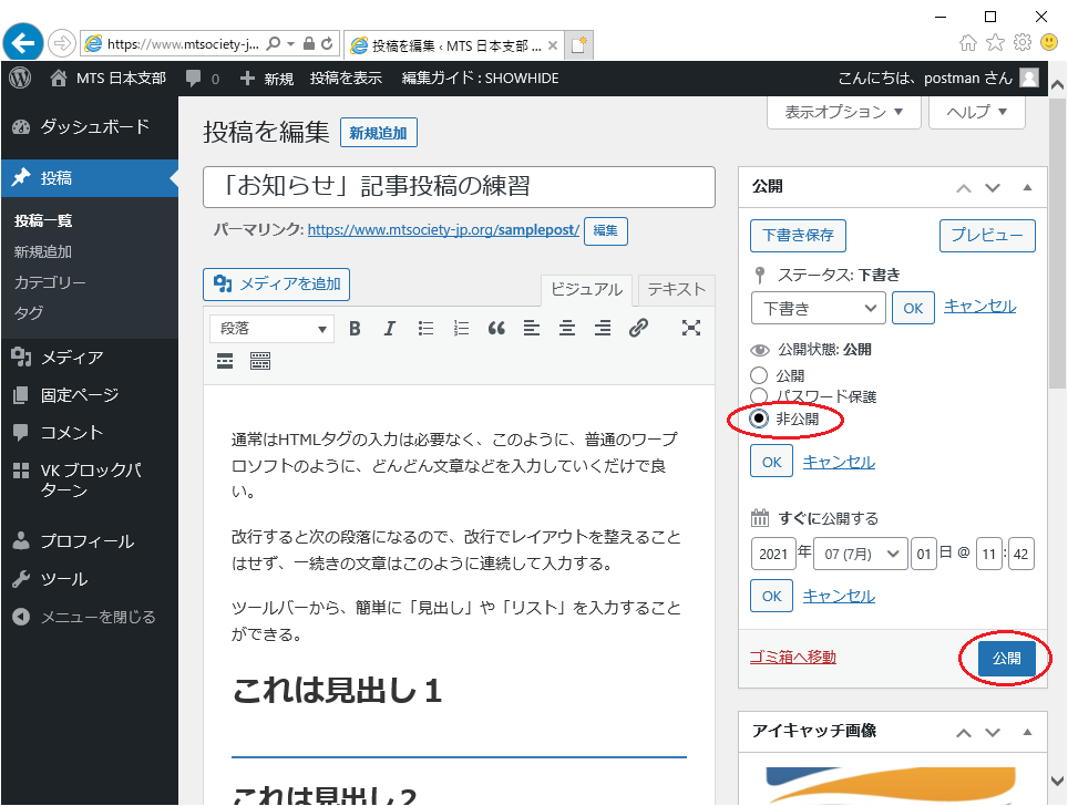 公開状態を「非公開」にすると、ログインしているユーザーだけに見える状態で、サイトに反映されるので、一般には公開せずに実際の表示を確認したい場合に役に立ちます。また、公開日時を未来に設定すると、指定した日時に投稿が予約されます。